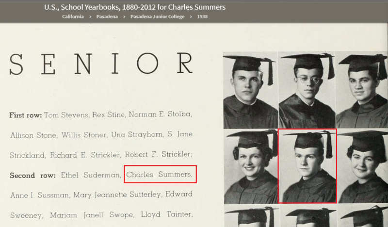 Charles Luther Summers was born on 23rd March 1918 in Cedar Rapids, Iowa. At a young age Charles and his parents moved to Pasadena, California. In 1938 Charles was a Senior at Pasadena Junior College.