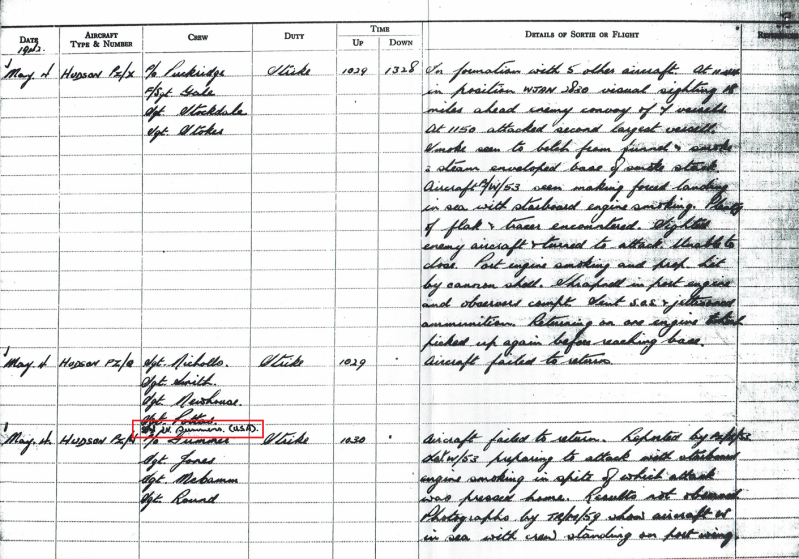 Note how 2Lt Charles Summers' name was added to the names of the Royal Air Force crew. Source: National Archives UK.