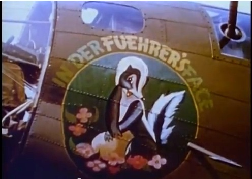 Above right: The same 'nose art' filmed by William Wyler's crew, prior to take-off for the Emden mission.