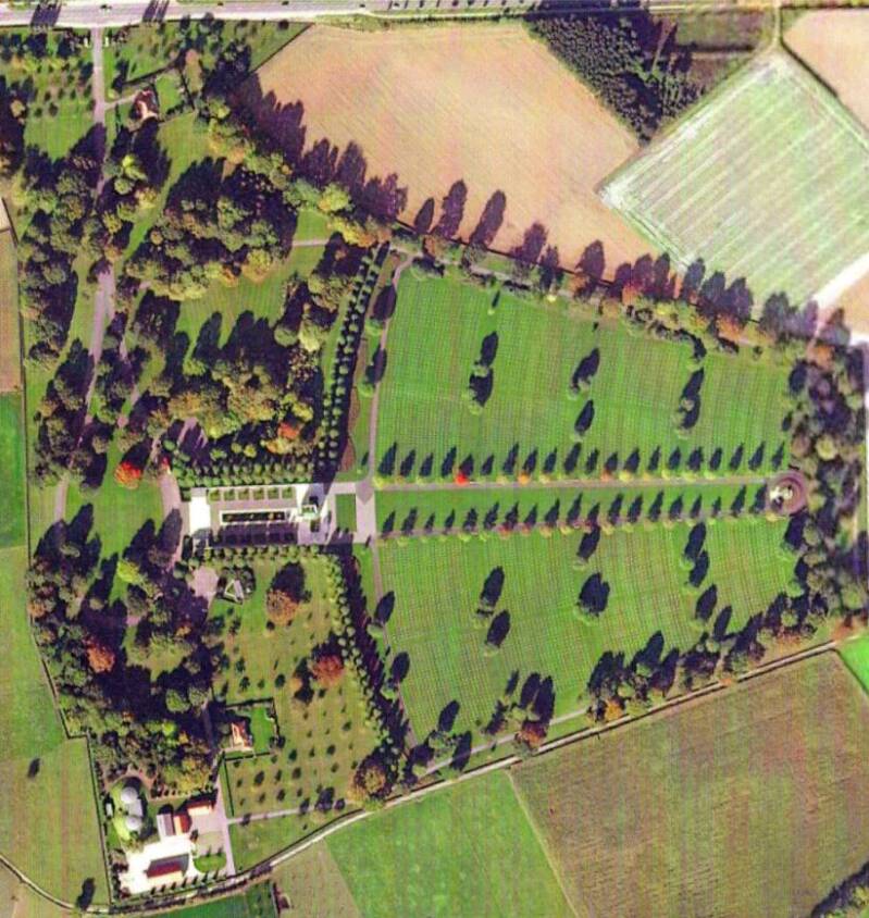 Photos above: an aerial photograph of Margraten Cemetery in 1946 and the lay-out of the respective burial plots. (USAAF / ABMC).