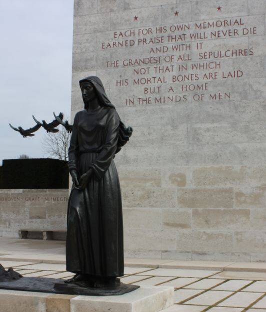 The cemetery is now the final resting place for 8,301 buried dead and the 'Walls of the Missing' commemorate 1,722 whose bodies were never found. The 'Netherlands American Cemetery and Memorial' is located 10 kms east of Maastricht, on the main road highway to Aachen, Germany. Margraten is 112 kms east of Brussels and 405 kms north of Paris.