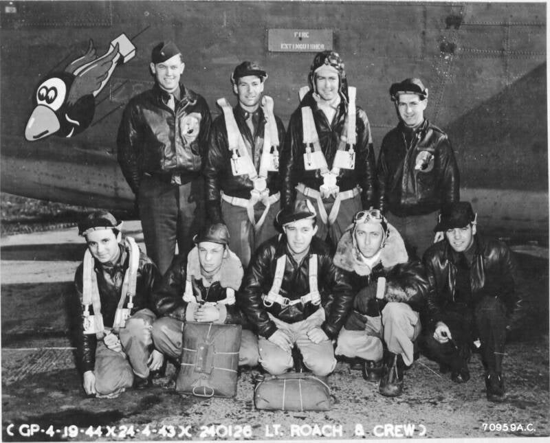 In this group photograph of the Lt Roach crew, Wyatt S. Kennon is pictured standing1st from right. (USAAF 70959AC).