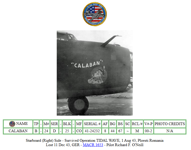 KIA 14th May 1943 as bombardier of B-24D / #42-40126 / 'Annie Oakley Crack Shot'